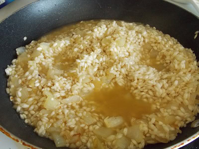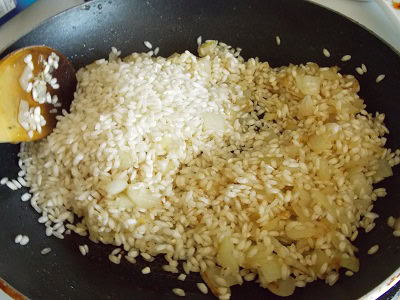 - Sprinkle in the risotto rice and toast it for a few minutes, stirring constantly. (I love letting the grains take on a light golden color — it adds extra flavor to the dish.)